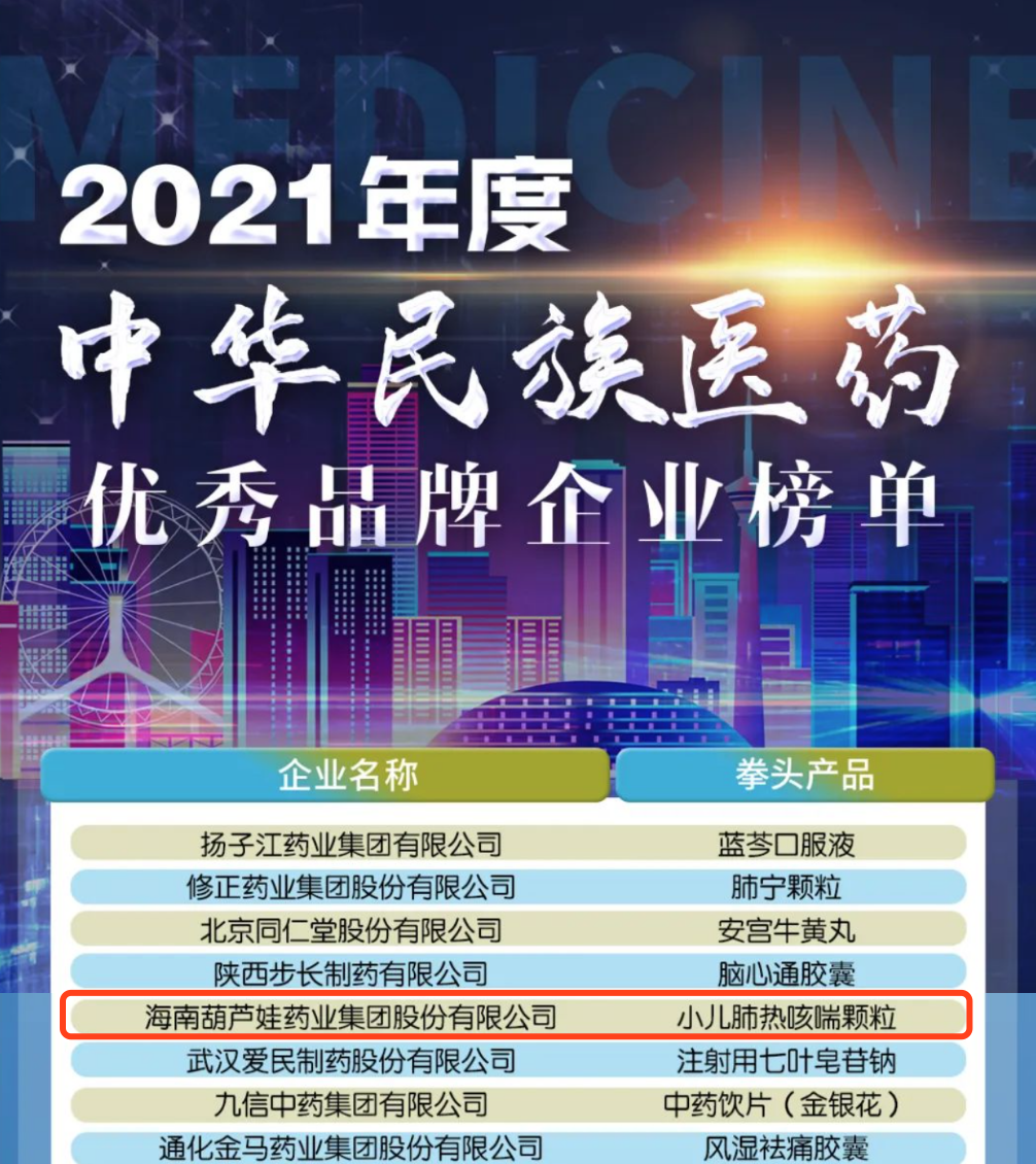 12月29日,全国工商联医药业商会发布了“2021年度中华民族医药优秀品牌企业榜单”,AG8旗舰厅药业集团凭借黄金单品小儿肺热咳喘颗粒(4克)实力登榜。